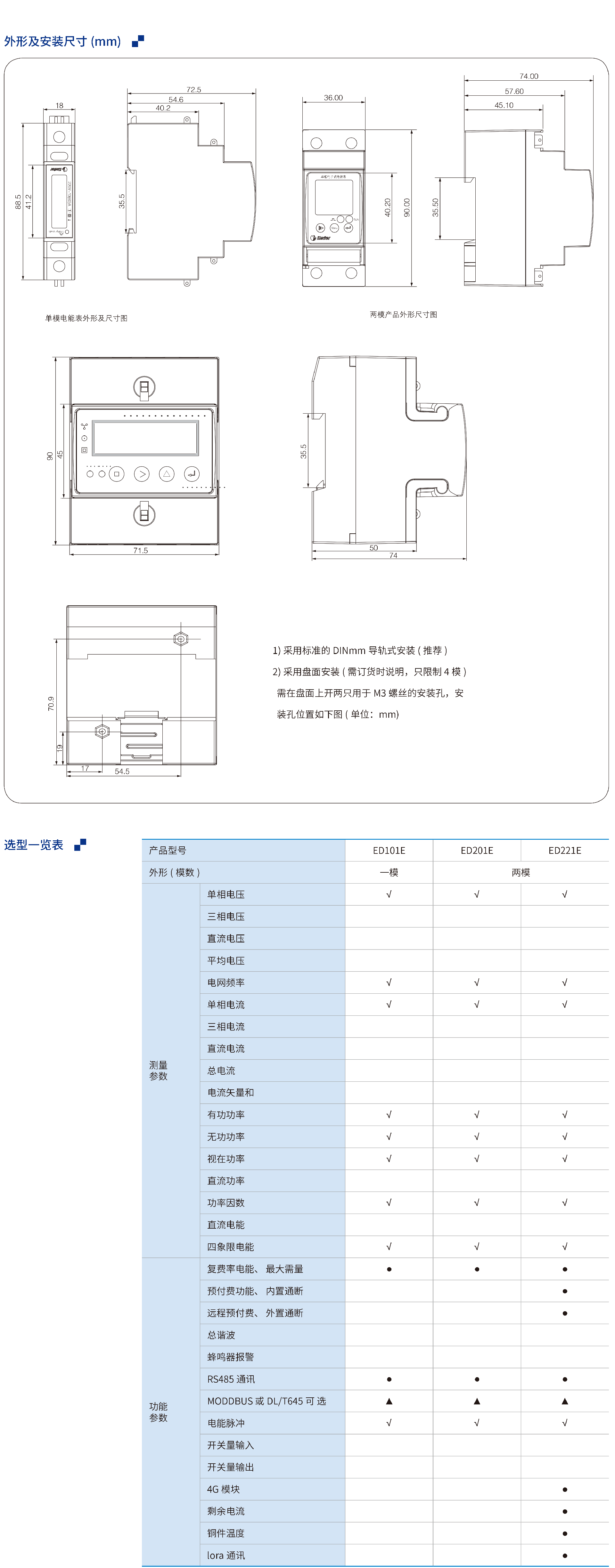导轨式电力仪表是参照GB/T 17215.211- 2006、GB/T 17215.321- 2008、GB/T 15284 - 2002、GB/T 29318-2012等国家标准设计而成,采用标准的导轨安装,主要用于单相交直流或三相低压网络的电参量计量。作为一种多功能电力仪表,它同时可测量单相或三相电力网络中的电压、电流、有功功率、无功功率、功率因数频率、电能等多种电力参数。所有测量得到的电力参数可过选配RS485通讯接口远传,方便用户进行用电监测、管理与集中抄表。此系列仪表可方便的安装于用电的终端配电箱中作为用电终端管理仪表。